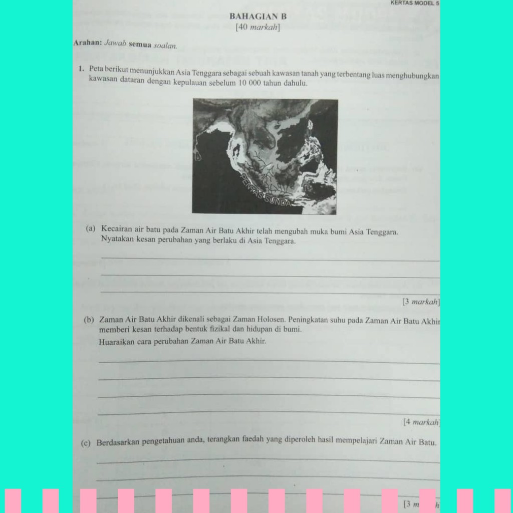 Aspek Ciri- ciri Fizikal bumi Permukaan laut yang membeku sebahagian besar bumi di liputi salji Aras laut Paras air laut yg rendah memperlihatkan pulau- pulau bersambungan dgn tnh besar memudahkan migrasi manusia dan haiwan. 23 juta hingga 5 juta tahun dahulu. Kepentingan penemuan lokasi Zaman Prasejarah di Asia Tenggara.