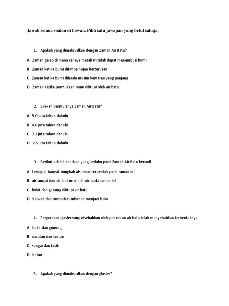 SEJARAH TAHUN 4 ZAMAN AIR BATU DRAFT. 1 Pilih penyataan yang betul tentang maksud Zaman Prasejarah. Glasier merupakan timbunan besar ais yang bergerak perlahan-lahan menuruni cerun dan merebak ke permukaan.
